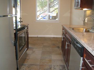 Slate floors, granite counters with stainless-steel appliances